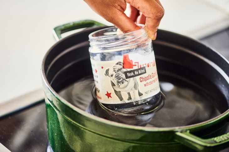 How to Remove Labels from Glass Using This Easy Method Use the tongs to take each jar out and let them cool on a dish towel. If they still have traces of the label or a sticky residue on the glass, rub those parts with baking soda — the glass should come clean in a matter of seconds. Then just wash the jars with soap and warm water and they're ready. (Image credit: Joe Lingeman)